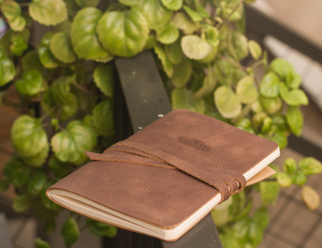 - Tapa 100% cuero color nuez con textura envejecida cerrado por un cordón de cuero evocando los cuadernos antiguos